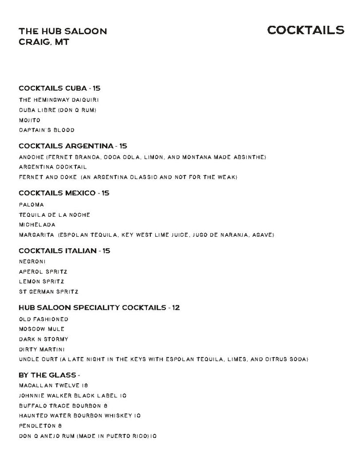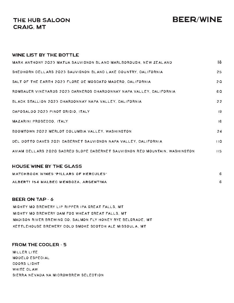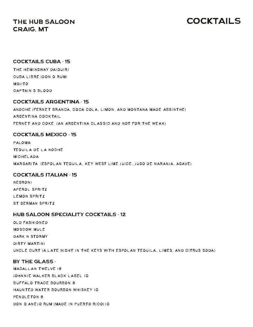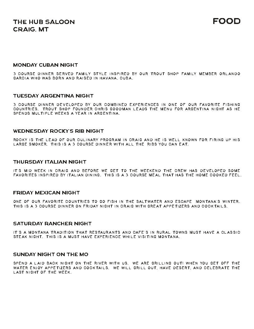 We offer dinner at the Hub Saloon, located at The Trout Shop Lodge. You can make reservations at The Trout Shop in advance, upon check-in, or fill out a reservation request below. We can have everything ready for you when you get off the water. We have a full service cocktail, beer, and wine menu. Call 1-(800)-337-8528 for more information as we have limited reservations.